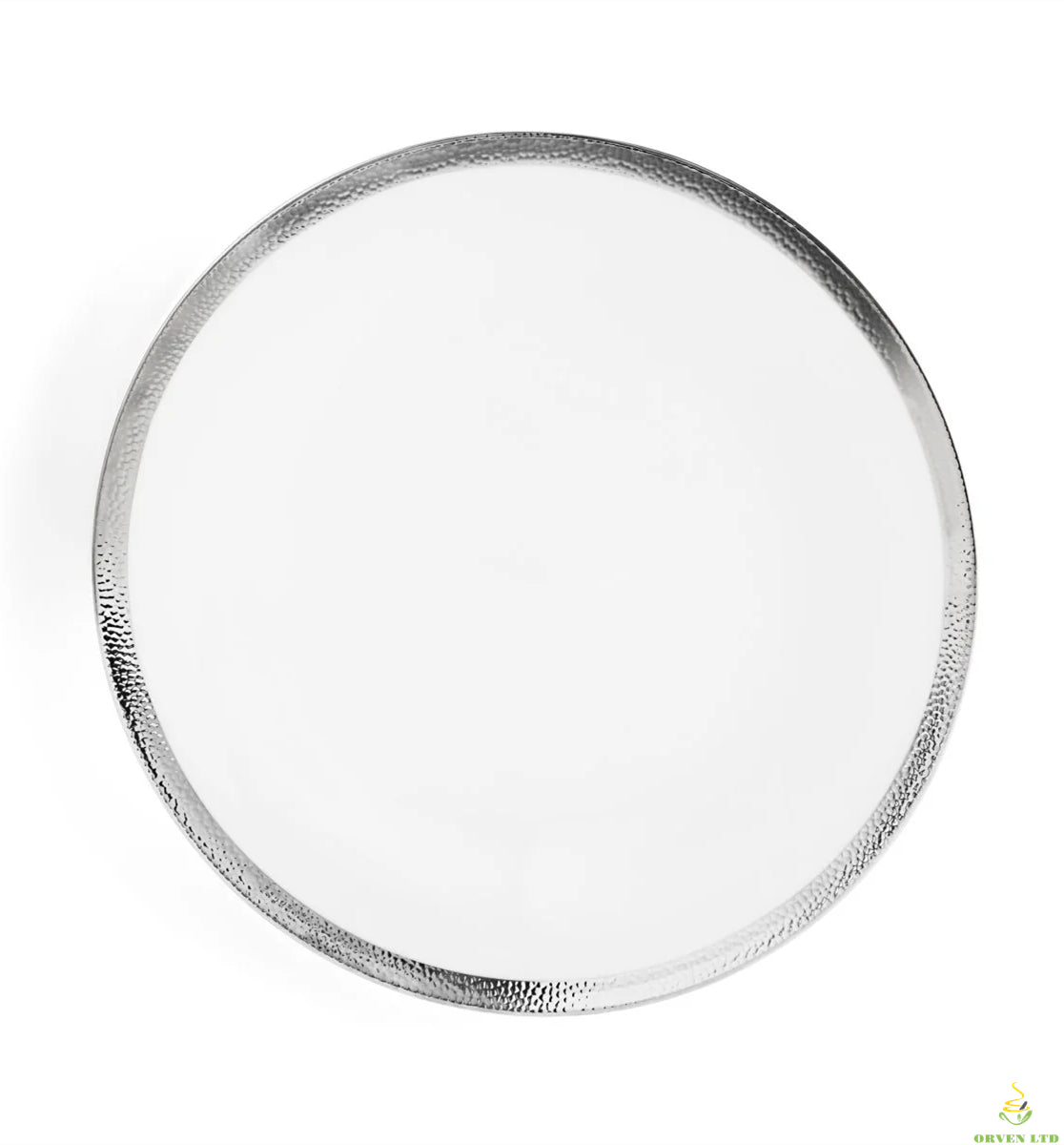 The metalware features a hammered texture with engraved surfaces, creating a refined yet casual, natural feel. The colors and details are meticulously crafted, creating a seamless, unifying pattern throughout the piece.